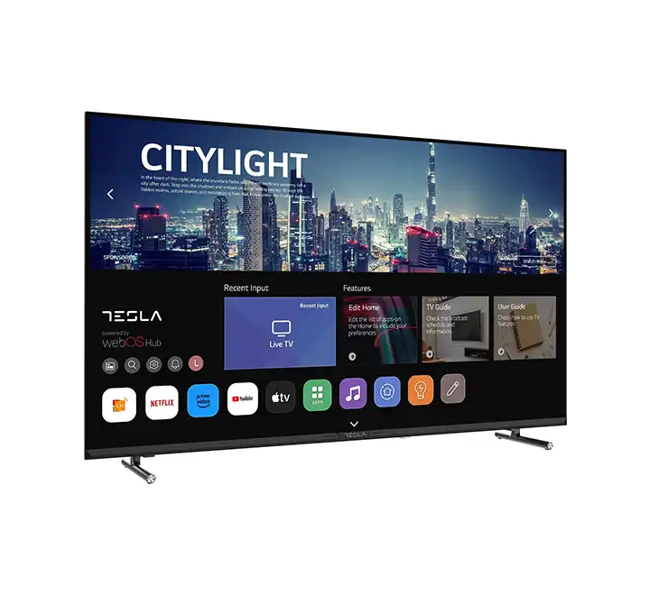 Najnoviji modeli TESLA TV-a pogonjeni su najnovijom verzijom operativnog sustava webOS Hub. Ova inteligentna platforma prilagođena korisniku dizajnirana je za pružanje izvanrednog audio-vizualnog iskustva uz podršku globalnog emitiranja. Omogućuje Dolby Audio, HDR i HLG kompatibilnost, kao i pristup nekim od najpopularnijih svjetskih aplikacija kao što su Netflix, YouTube, MAX, Disney+ i druge.